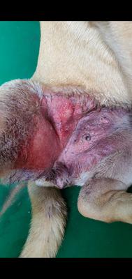 Leticia, thank you for sharing the photos and details. From the images, it appears that Lucy has a large, inflamed, and ulcerated area near her nipple and extending down her leg. The skin looks raw and red, with signs of thickening and possible infection. The fact that it’s spreading and not responding to topical antibacterial spray suggests this is more than a superficial irritation and needs prompt attention.